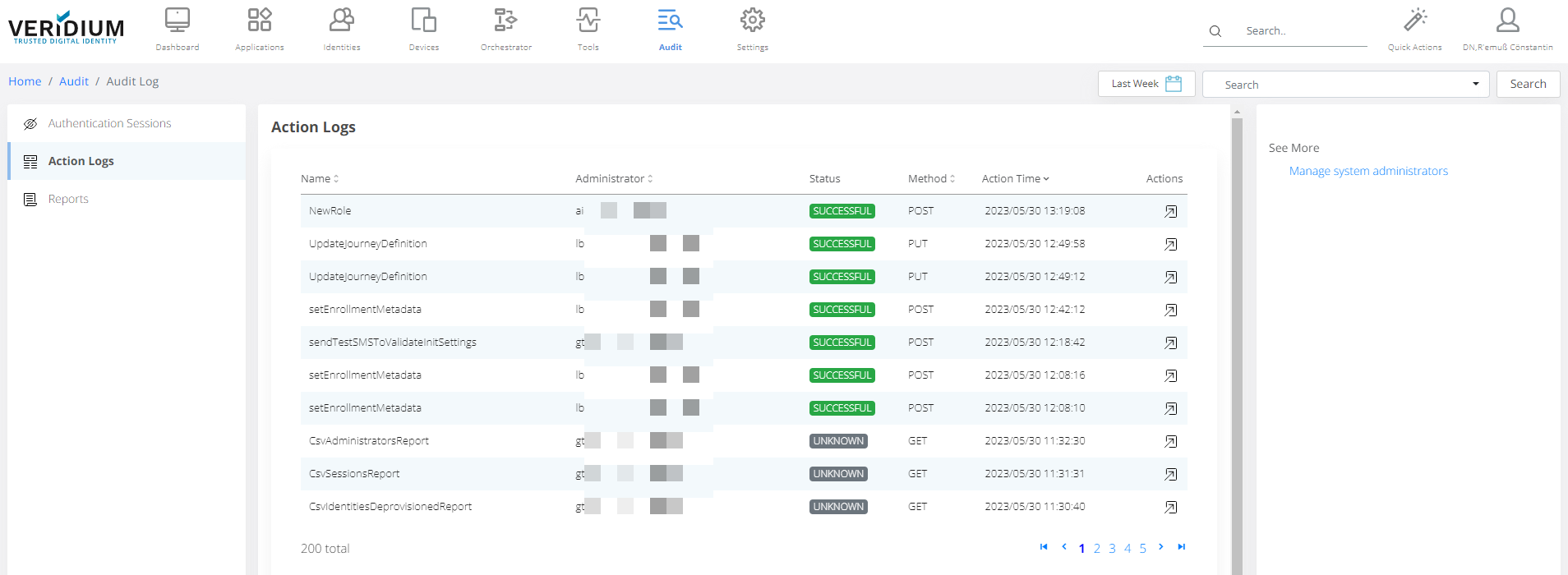 Action logs represents all actions in VeridiumID configuration done via the Veridium Manager.