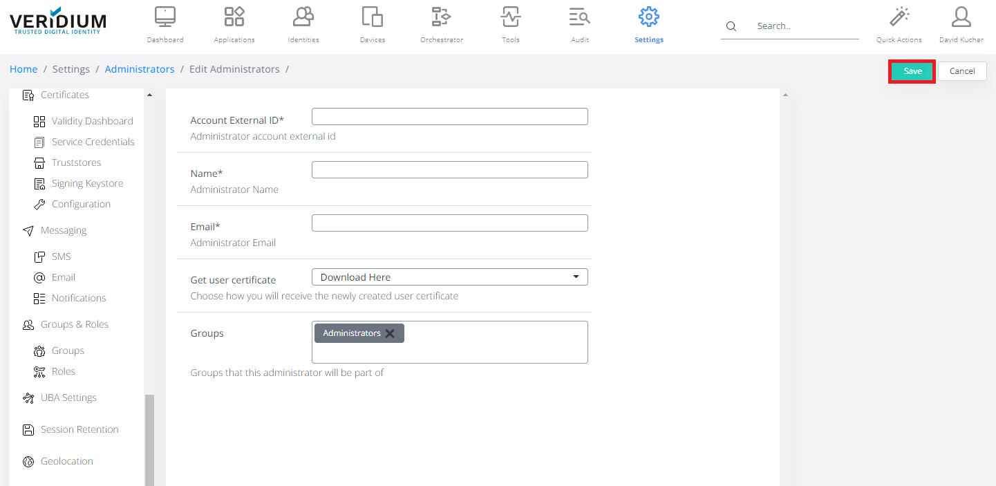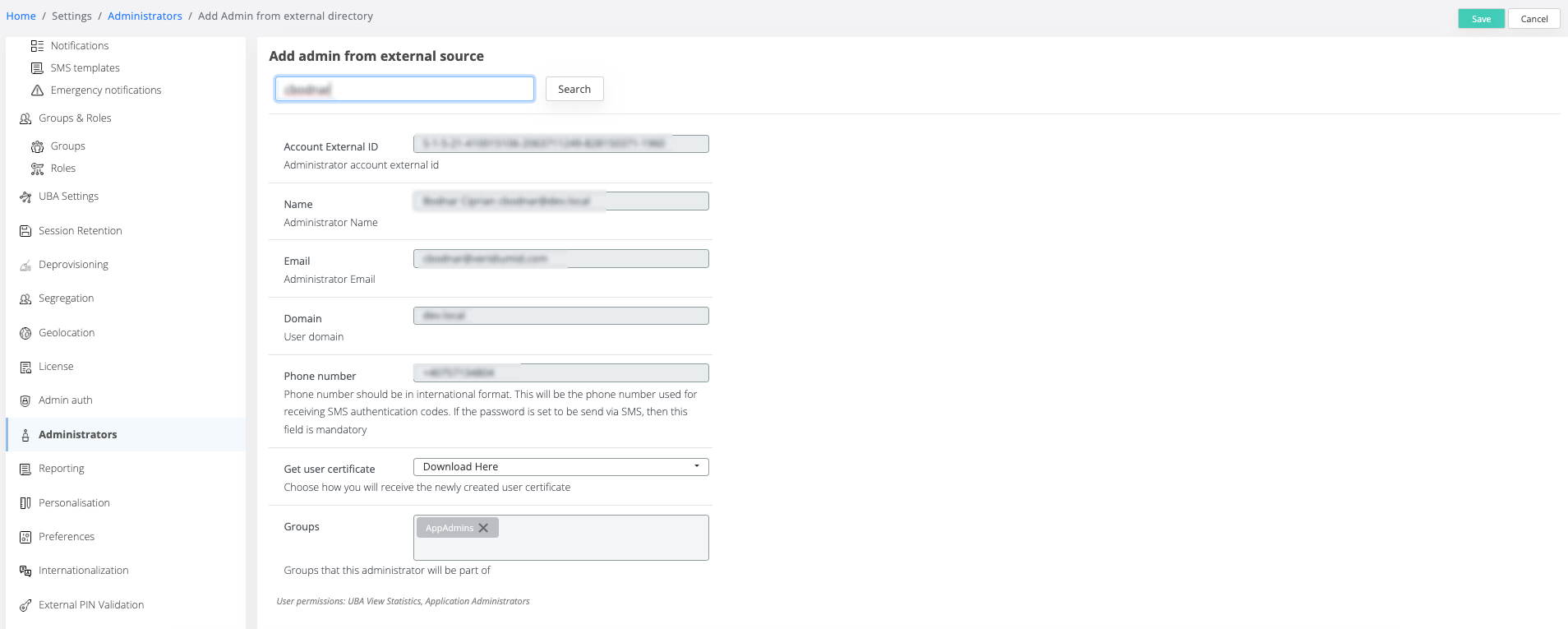 Account external IdFor the “Get user certificate” select whether you want to download certificate locally or send it to email. This is the same for both way to create administrator.