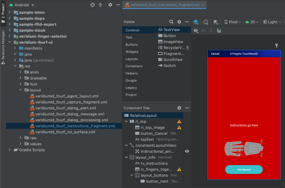 Any aspect of the UI can be altered by importing the project veridium-fourf-ui and editing its source. The following example demonstrates this using the sample-ffid-export app provided in the Android Quickstart package.
