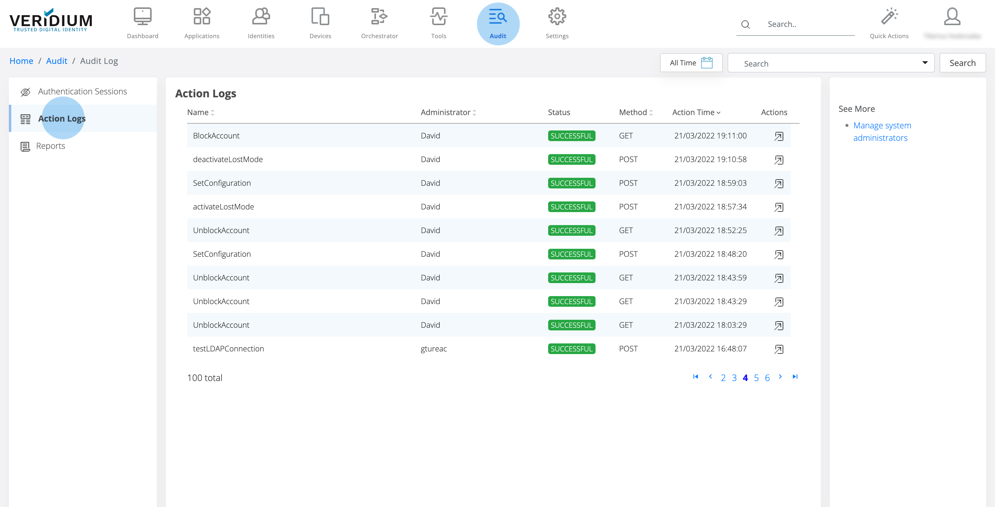 To see the latest entries, go to Veridium Manager / Audit / Action logs. Searching and sorting can be applied to the list of entries for a more powerful insight on system operations and administrators’ activity.