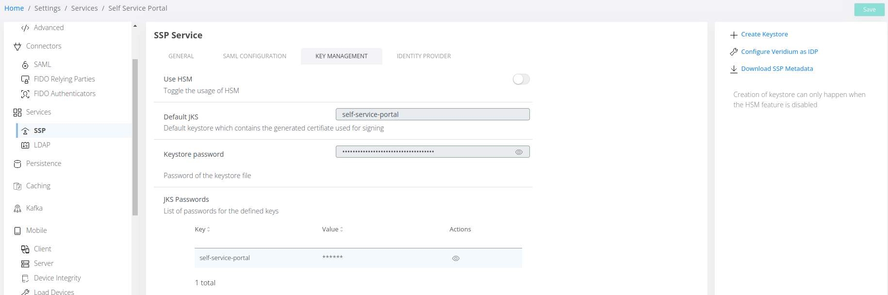 Connect to the Admin Dashboard and navigate to Settings → Services → SSP → Key Management and click on Create Keystore: