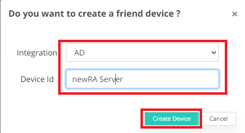The following pop-up window will appear. Select AD (Active Directory) as integration type and enter Device ID as free text to identify calls from this service. Finally, press Create Device button.