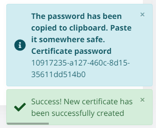 The Certificate password. New certificate and key in PFX format can be found in Windows download folder.