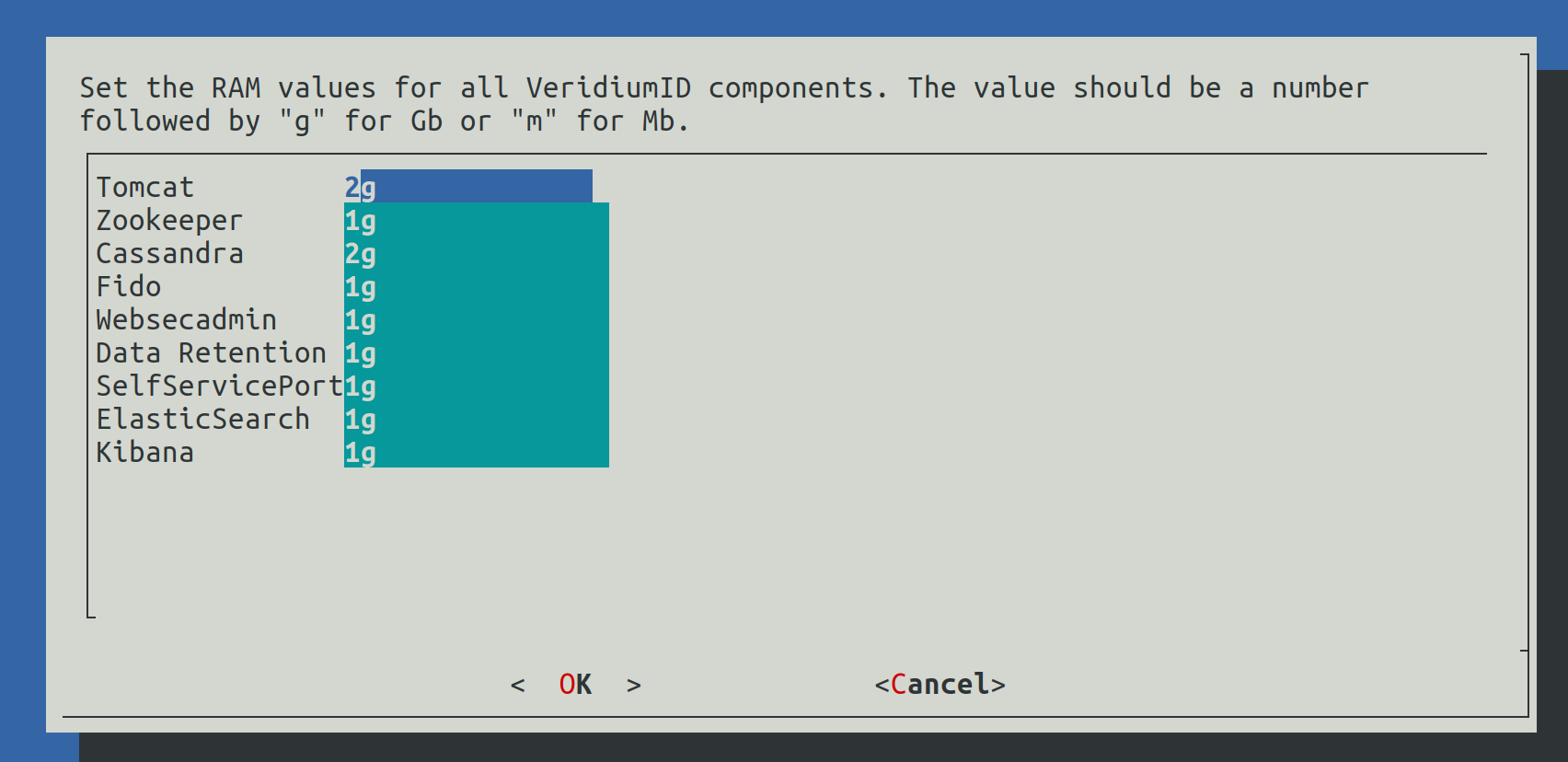 In this step the RAM values for different components will be configured. The value must contain a number followed by g for Gb or m for Mb.