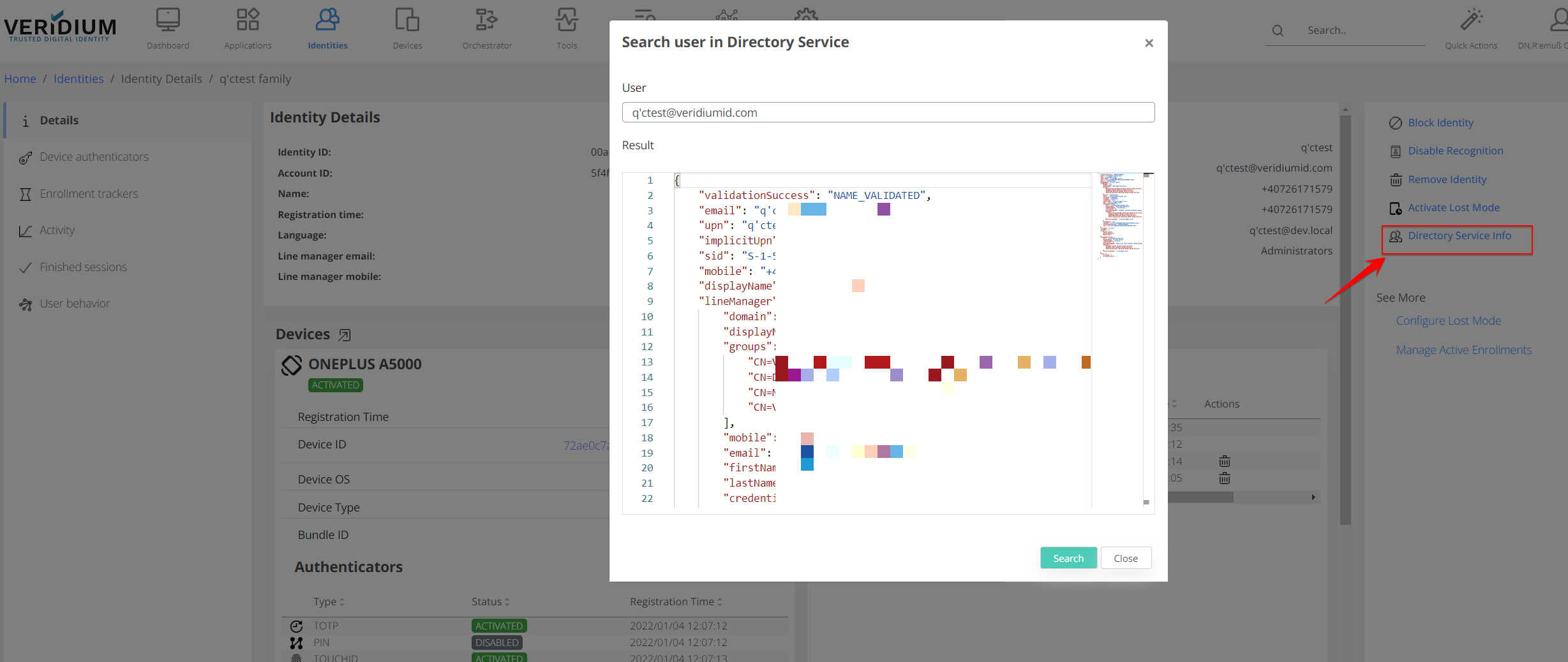 This option present on the right side menu allows for a quick interrogation of the Active Directory and displays the account information returned.