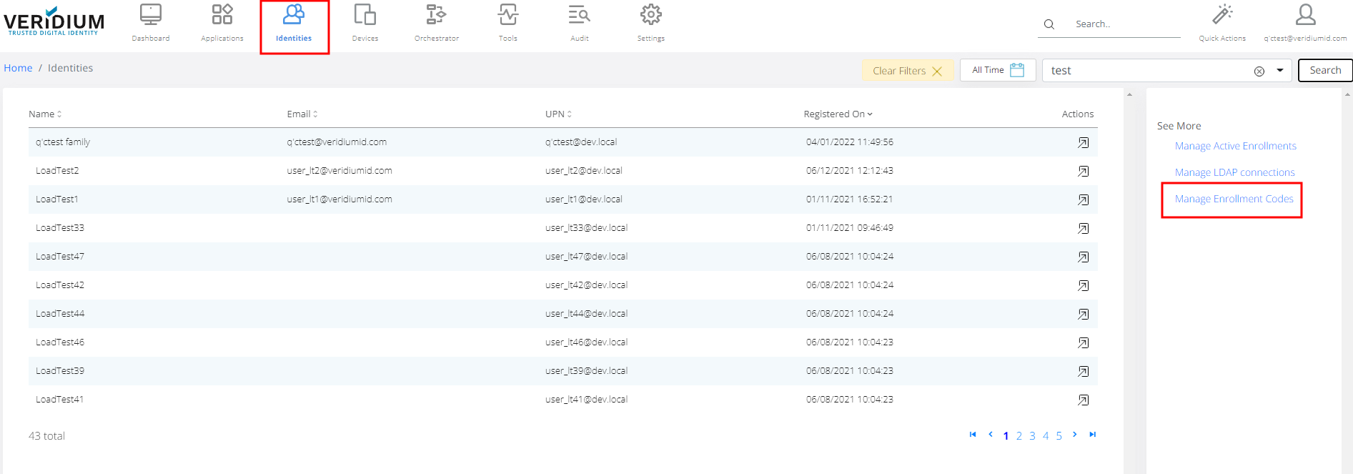 or from Admin/Identities tab/ Manage enrollment codes button from the right side of the screen
