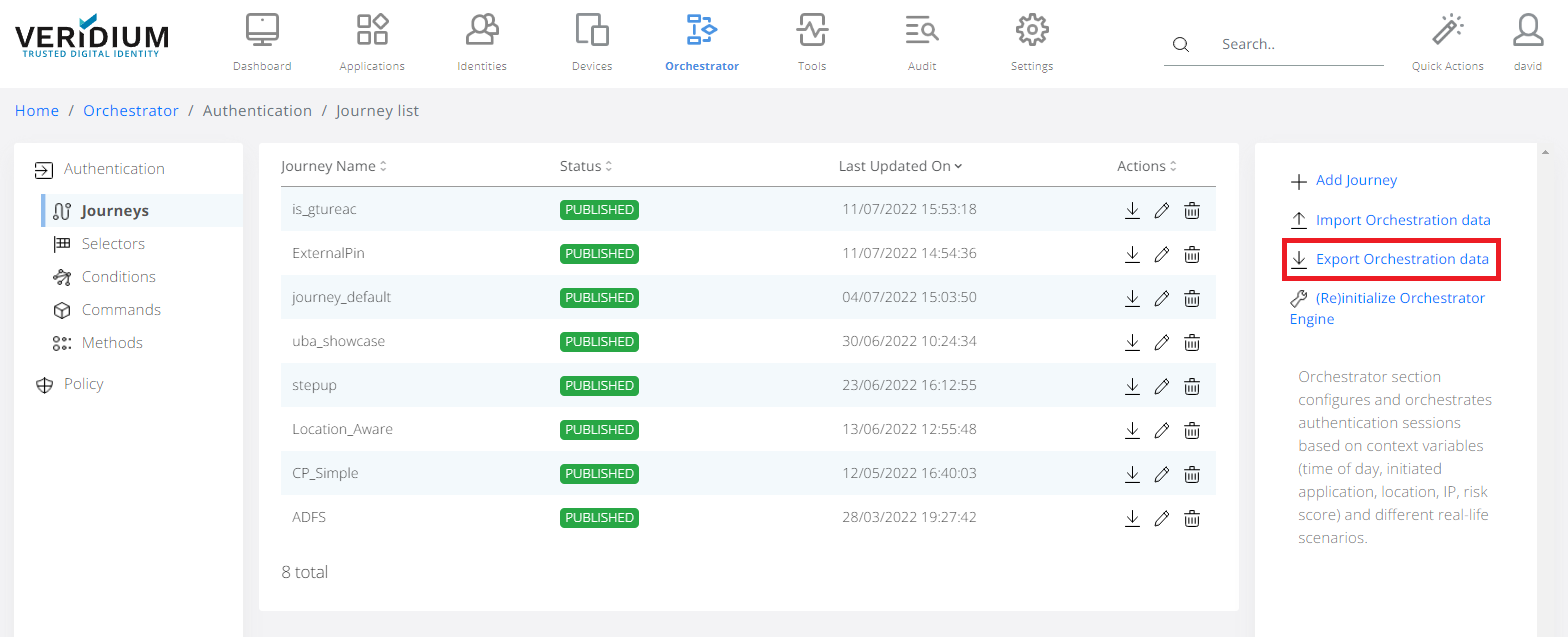 1. In Veridium Manager, click Orchestrator on top navigation. The list of existing journeys is displayed.