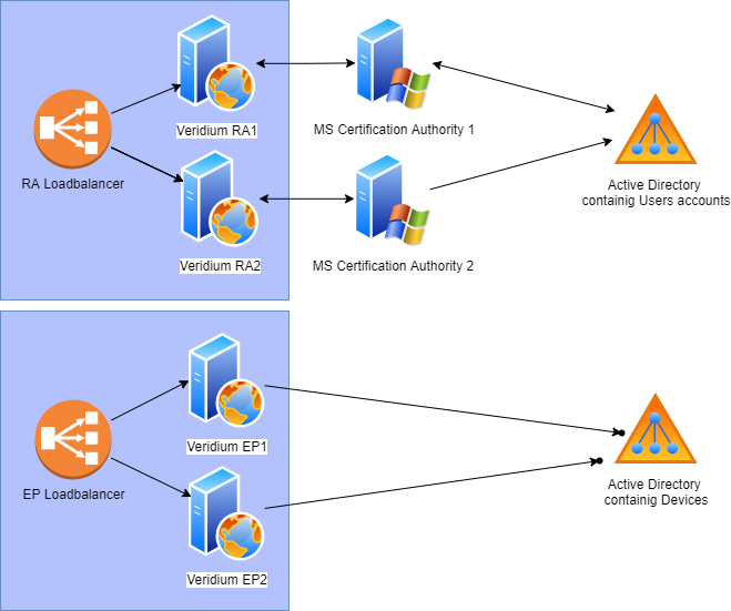 When you need to achieve High availability, you need to install several instances of Veridium RA/EP servers and place loadbalancer in front of them.