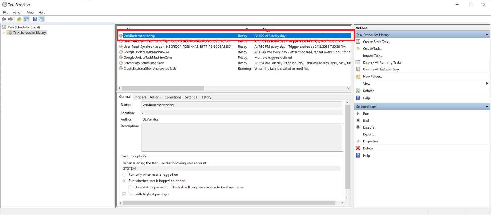 After successful VeridiumID RA & EP installation, Task Scheduler starts monitoring task regularly. Frequency is adjustable, default is every day.