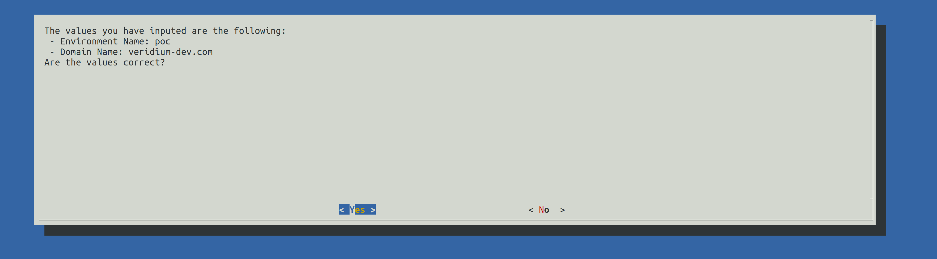 Write the correct EXTERNAL FQDN in place of ext-poc.veridium-dev.com and press the TAB key to go to OK and press Enter to continue.