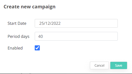 - Enabled (on/off switch) - indicates if the campaign should become available right away. Note that only one enabled campaign can be enabled at a time. Also an active campaign can not be deleted, it needs to be disabled first.