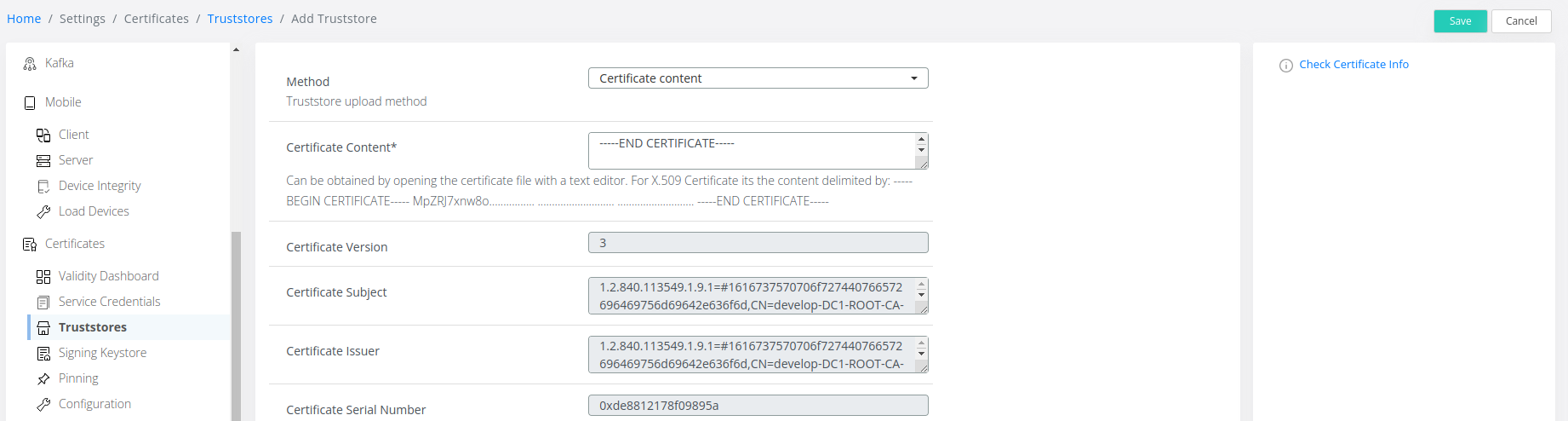Click on Add Truststore select Certificate Content as Method, copy the certificate’s content in the Certificate Content section and click on Get Certificate Info: