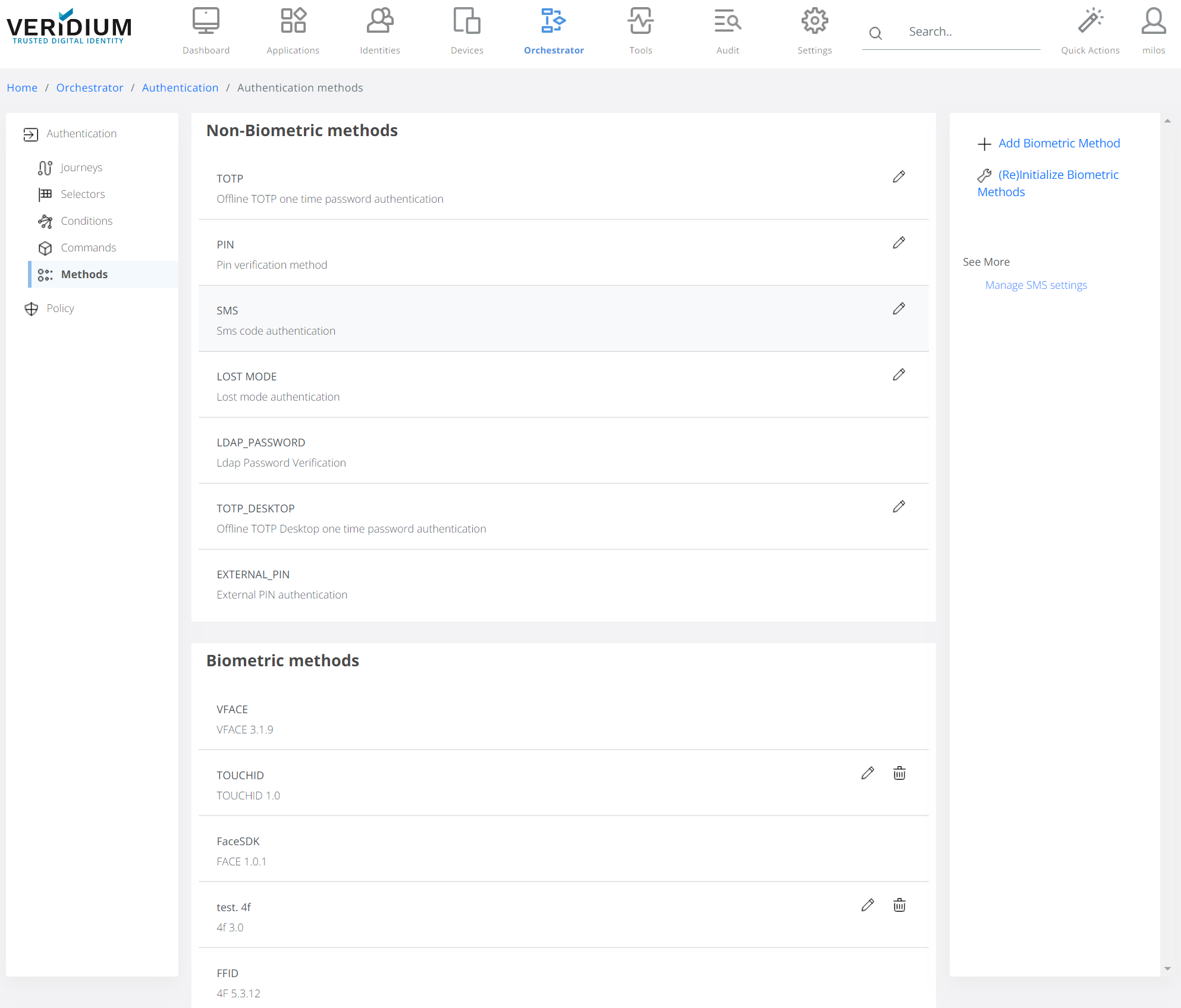 List of authentication methods available for commands used in Journeys.
