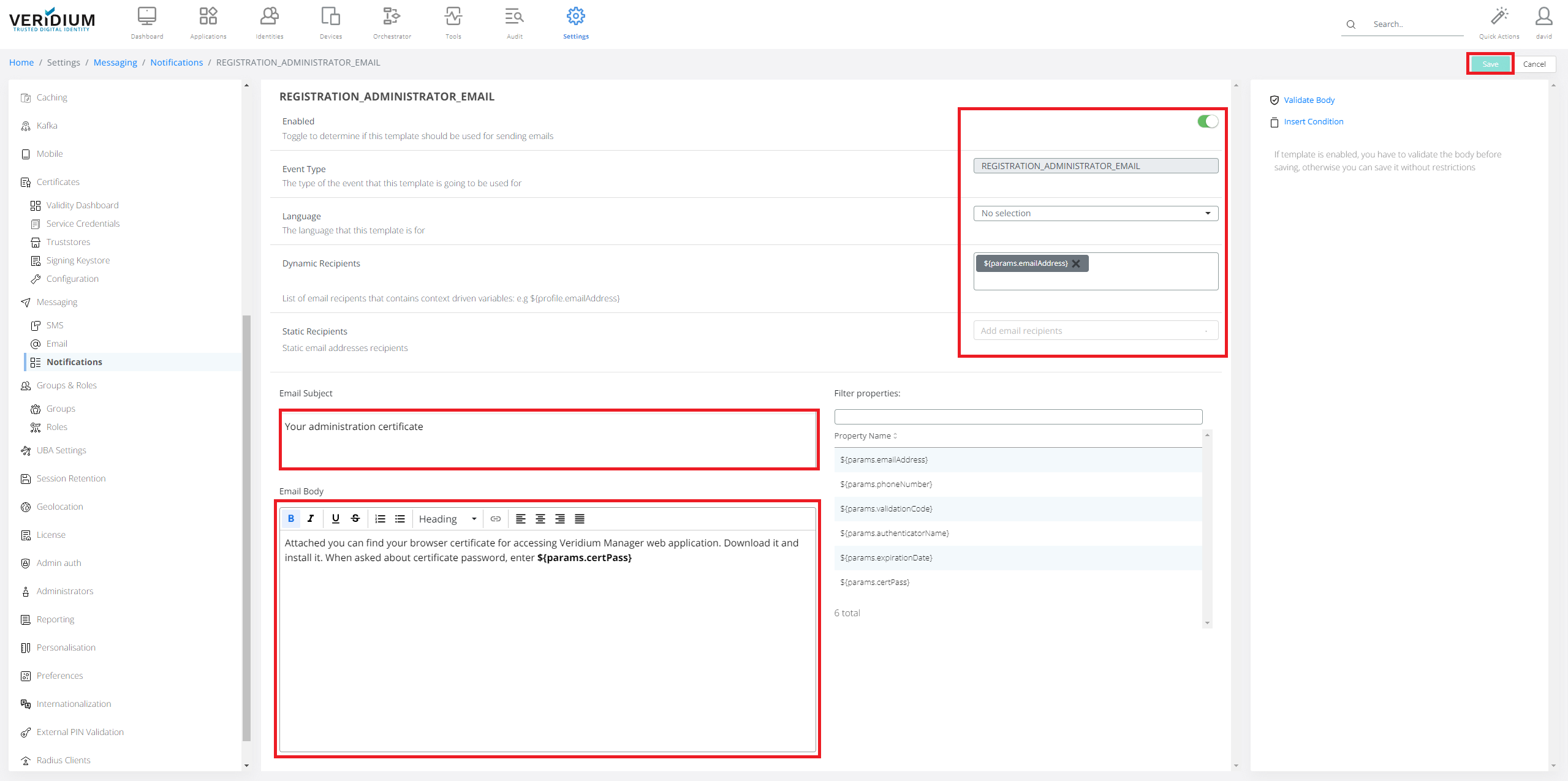 Set Settings, set Mail Subject and set Email Body. Click Validate Body and Save.