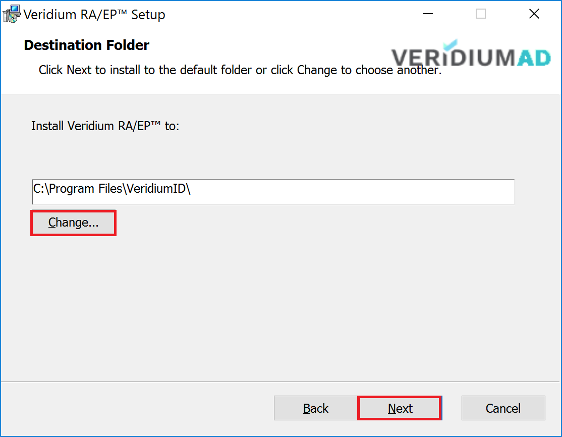 Click “Next” if you prefer to install RAEP on disk C. If you want to choose a different location, click the “Change” button."