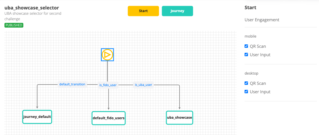 Transitions with conditions on them lead to journeys that can be chosen for the execution of the authentication. See Journey on how to define transitions.