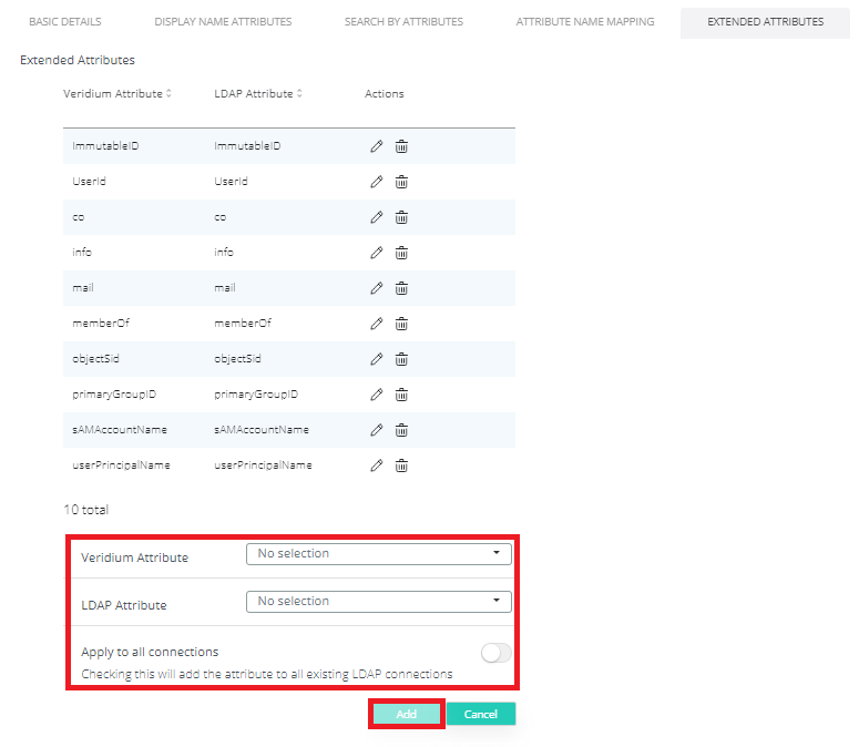 If there are multiple LDAP connections and the extended attributes apply only to some of them, then these connections can be selected in the “Connections” field. This operation can be done for each connection individually also. See next section.