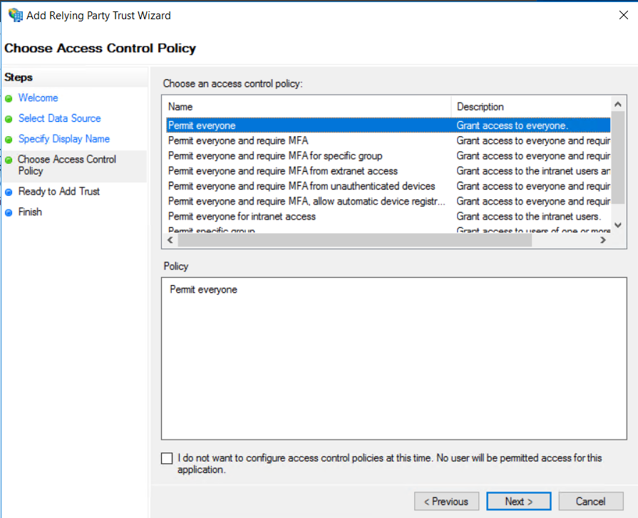 Select Permit everyone as an access control policy and click on Next: