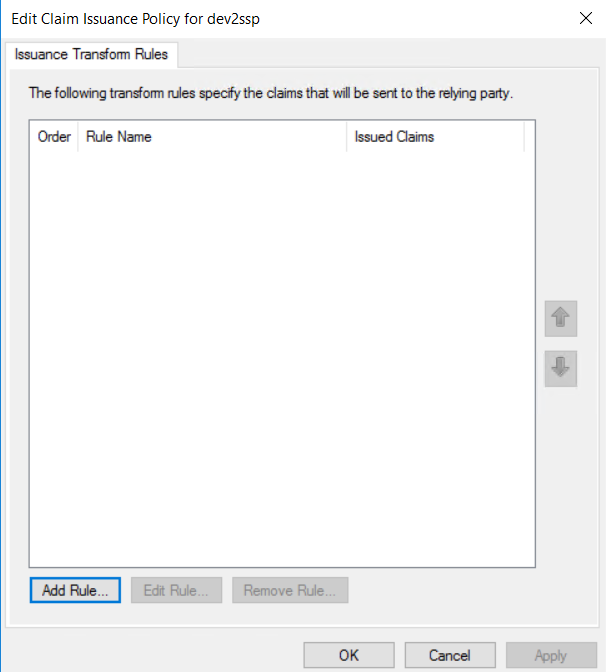 In order for the authentication to work, we need to pass the user principal name as NameID. This can be done by creating a transform rule. In the Edit Claim Issuance Policy for dev2ssp window click on Add Rule: