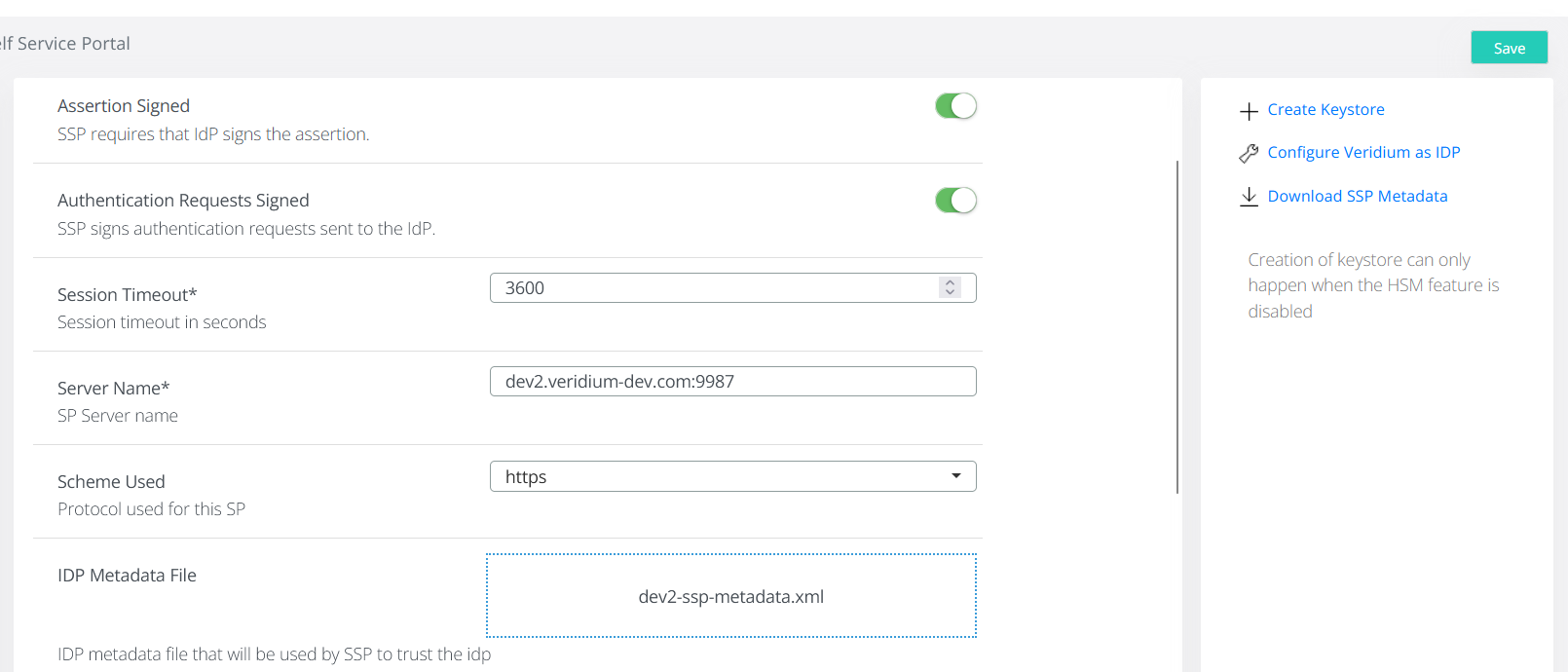 CODEGet-AdfsRelyingPartyTrust "dev2ssp" | Set-AdfsRelyingPartyTrust -SigningCertificateRevocationCheck none -EncryptionCertificateRevocationCheck noneNow you must set ADFS as idp for Self Service Portal. First you need to extract the ADFS metadata file. This is available at the following link: https://<adfs-fqdn>/FederationMetadata/2007-06/FederationMetadata.xml (type the correct fqdn of your adfs server). After downloading the metadata file, go to VeridiumID manager in Settings->Services->SSP and load the file in the IDP Metadata File section. Click on Save to finish: