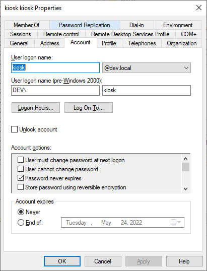 1. Start Active Directory Users and Computers and create Kiosk account.