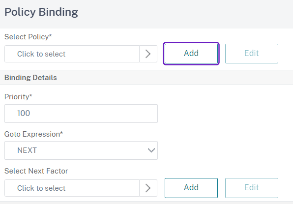 In the Policy Binding section click on Add: