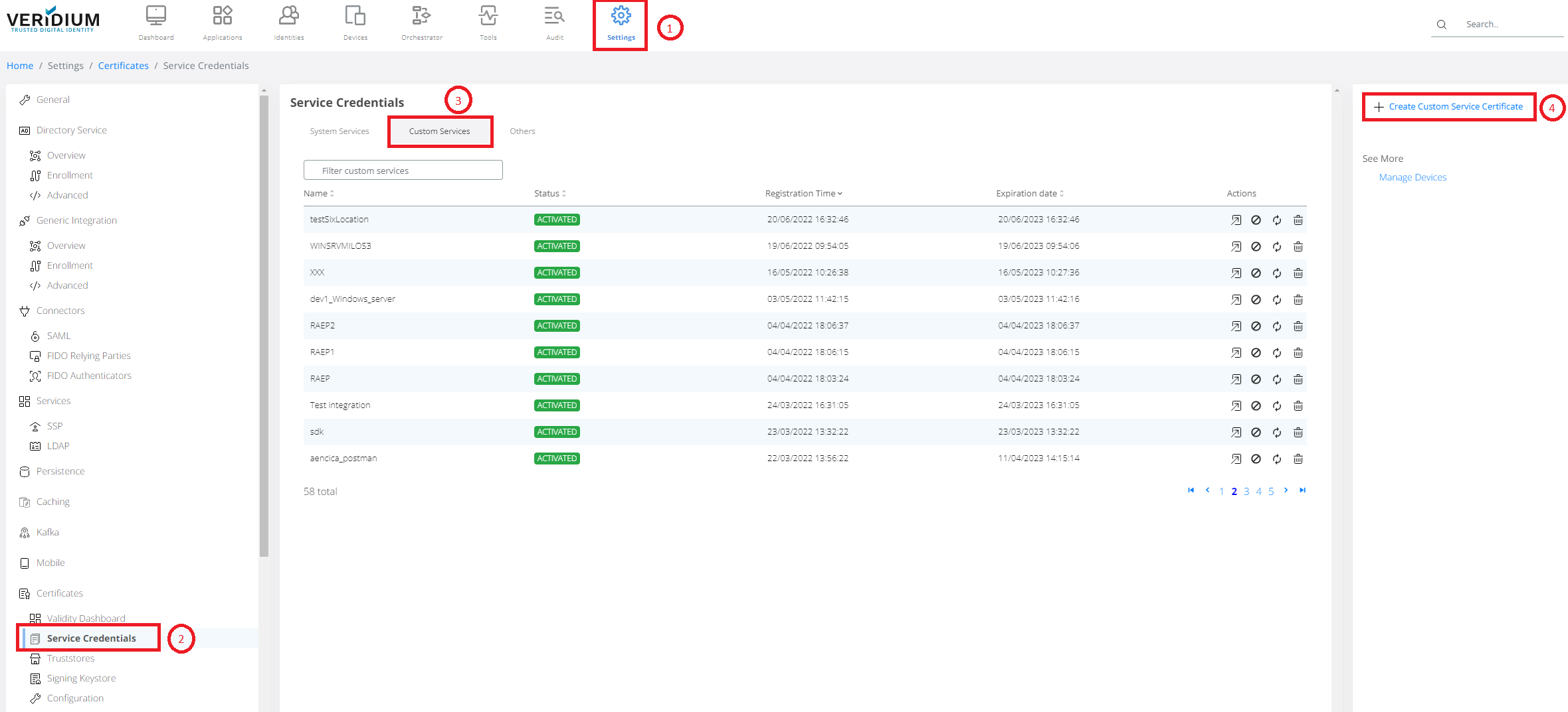 To create new Friend certificate, go to Settings(1)->Certificates->Service Credentials (2). Than select Custom Services tab. To generate new Friend certificate, click to +Create Custom Service Certificate (4) from action menu on right side.