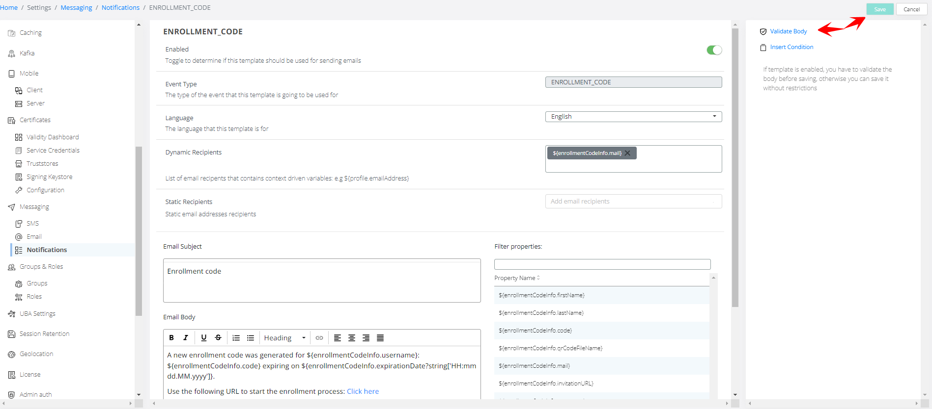 Enrollment email template options. Don’t forget to validate body and save, after all desired changes are in place.