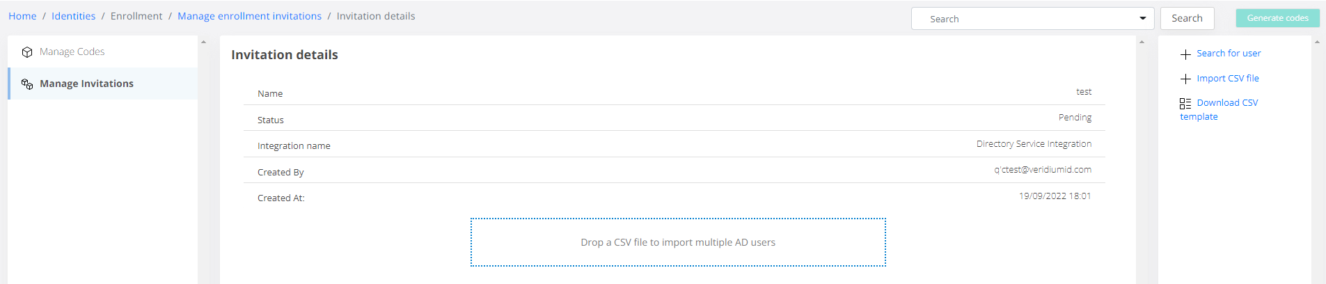 The page used for managing enrollment codes is enabled if there is any integration with Enrollment by invitation enabled and it can be reached by selecting “Manage Enrollment Invitations” option from the right side of the Identities page.