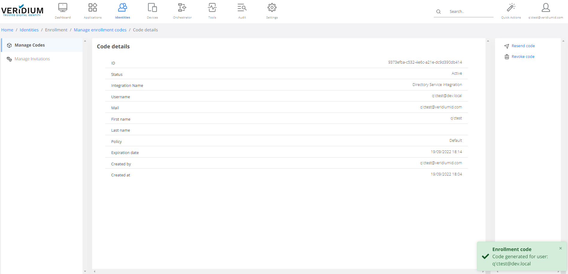or from Admin/Identities tab/ Manage enrollment codes button from the right side of the screen