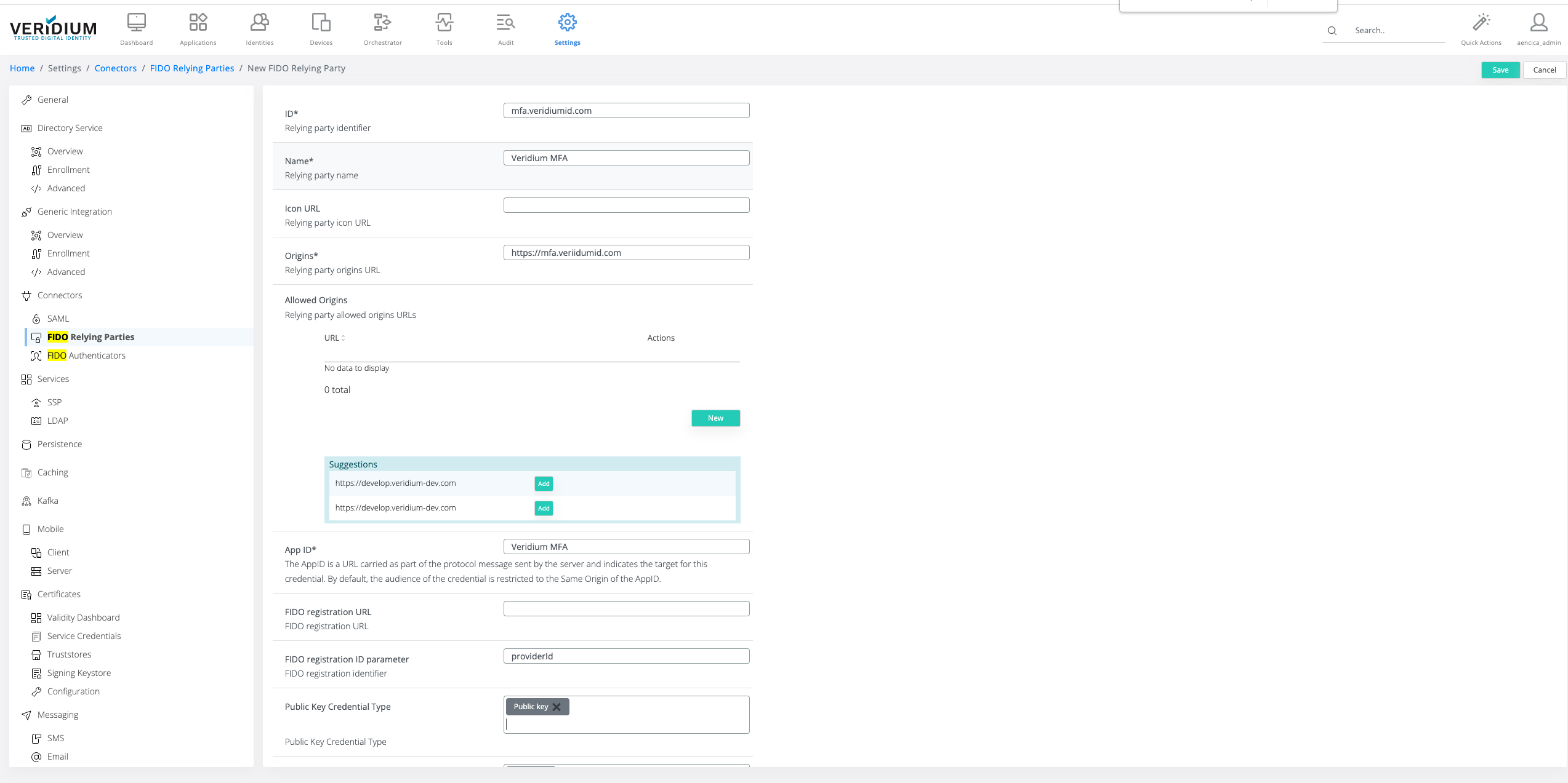 FIDO Registration Id Param Name: During FIDO enrollment delegation, the delegated service requires the origin of the service providing the registration. When using Veridium IdP for FIDO authenticator enrollment, the value is providerId. Leave blank if FIDO enrollment delegation is not used. (see Configure FIDO Authenticator Enrollment)