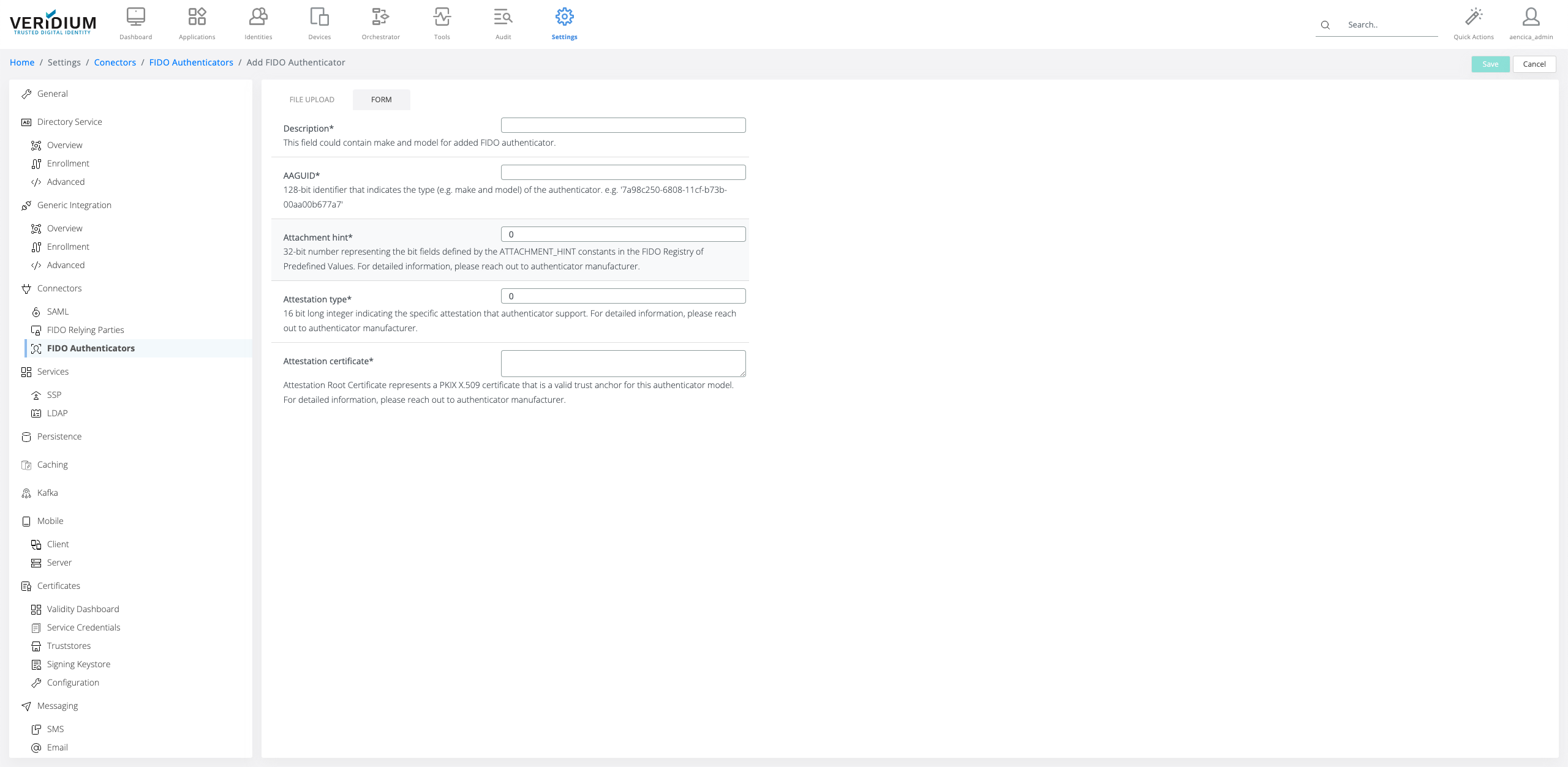 Upon deployment the FIDO server must be configured in VeridiumID Server using the Admin Dashboard