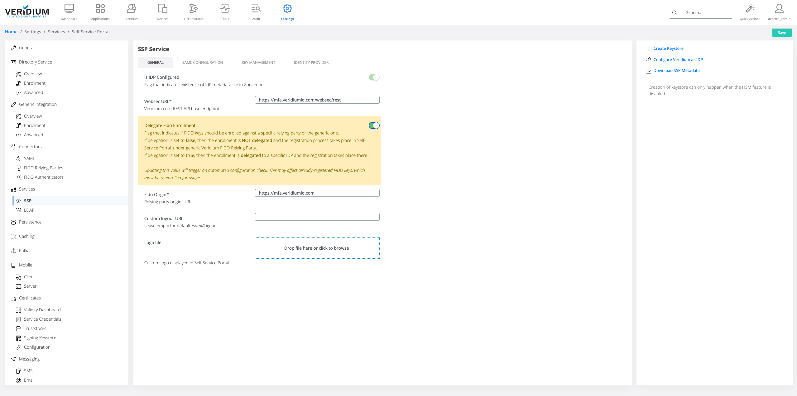 Using Veridium Manager: Settings/Services/SSP the following settings should be configured: