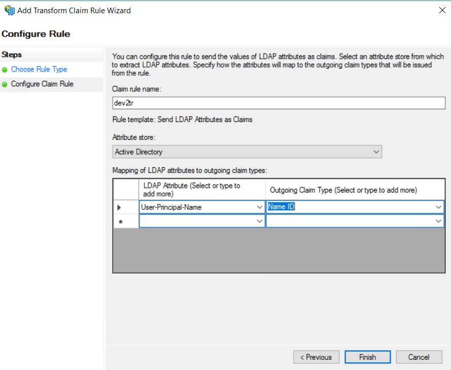 Set a name for the rule, then select Active Directory in the Attribute store section. Map the User-Principal-Name attribute to the Name ID outgoing claim type and click on Finish: