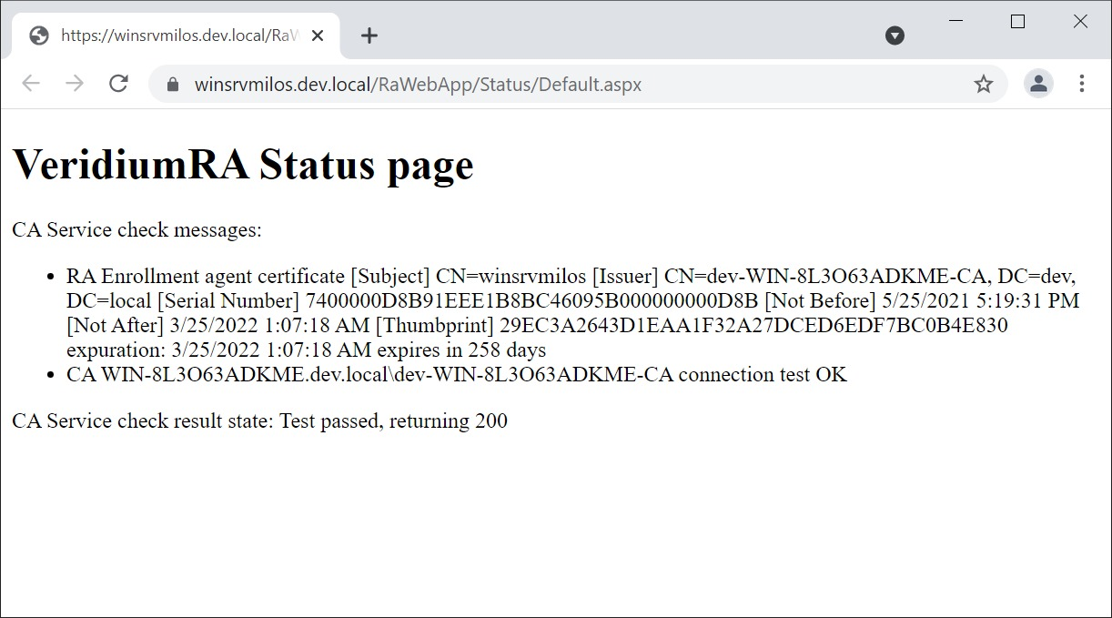 Note: The following URL can be used to verify status of RA by load balancers: https://ra_server/RaWebApp/Status/Default.aspx In case Test passed, page returns 200, otherwise 207.