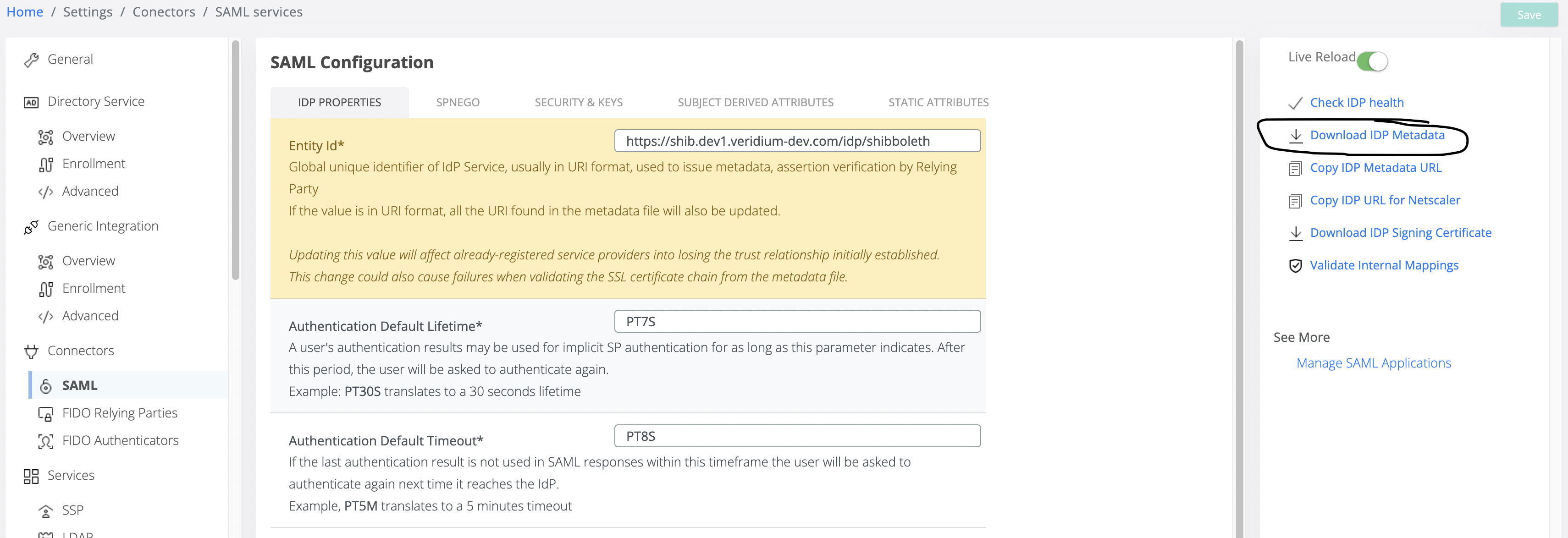 Veridium administrator must download the new metadata file (see picture bellow) and distribute to other services.