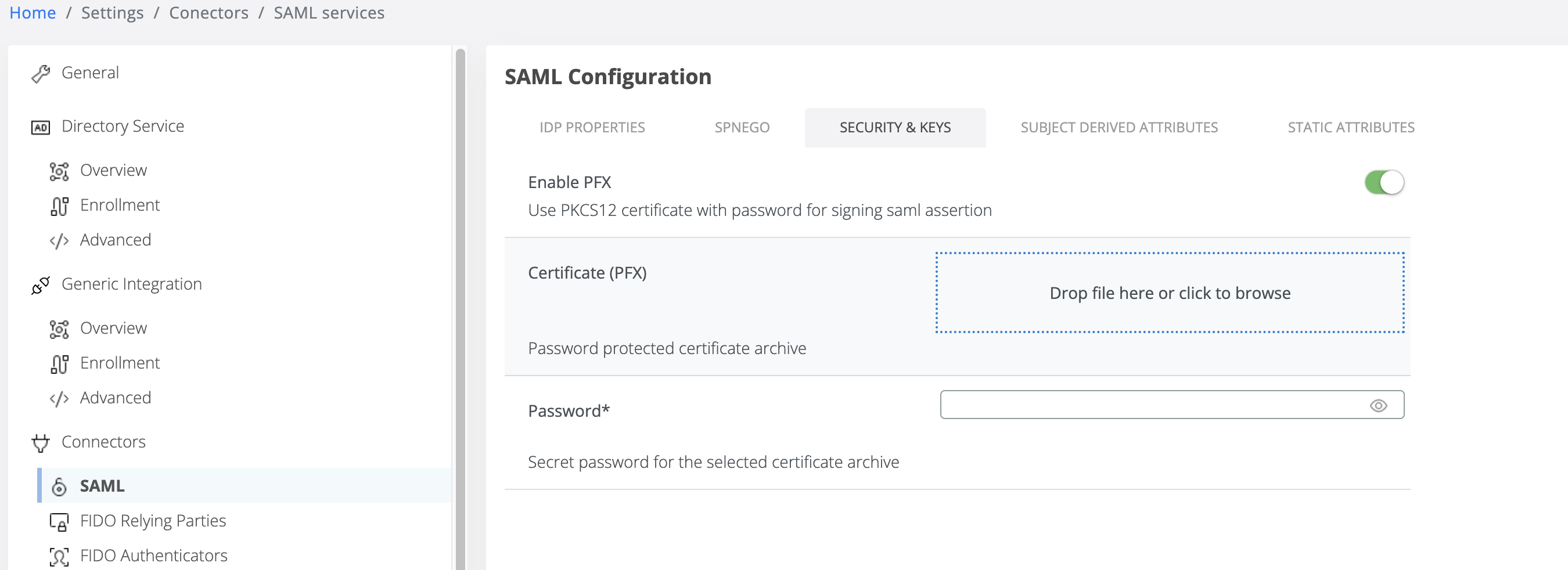In order to do, please check “Enable PFX” toggle button as in picture bellow, which will switch the user interface to the upload form in this format.