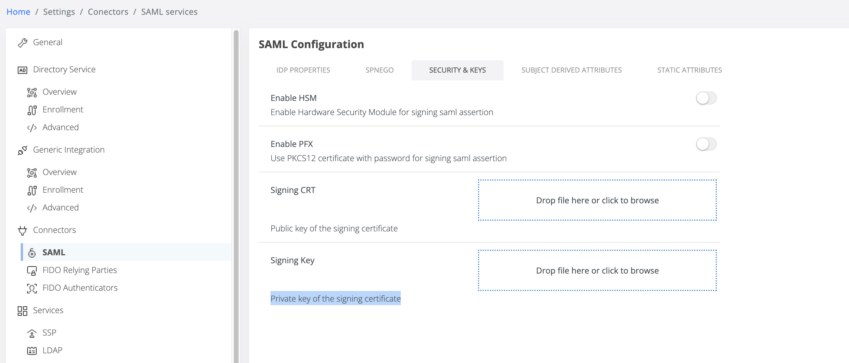 In Settings \ Connectors \ SAML, admin can access SAML IdP configuration